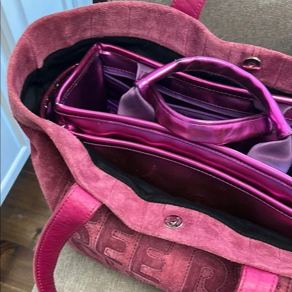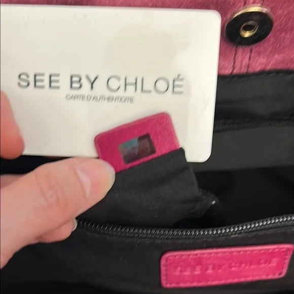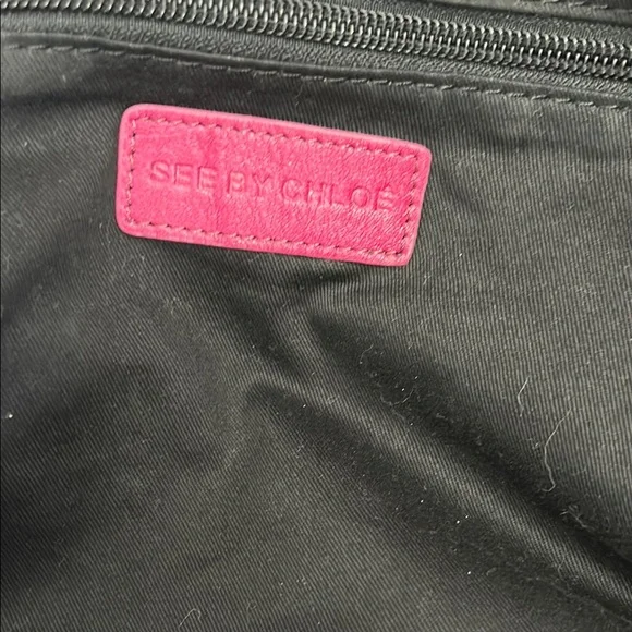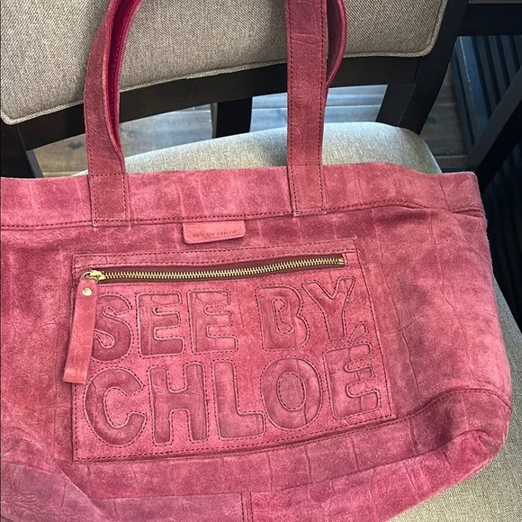This See By Chloe tote bag in a soft pink hue offers a blend of casual elegance and practicality. Crafted from a luxurious suede-like material, it features a spacious design perfect for everyday use. The embossed brand detailing adds a touch of sophistication to this chic accessory. Organiser comes with the bag.